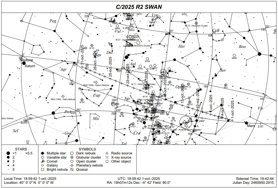 El 15 de septiembre, ya con magnitud 6, el Minor Planet Center le dio la designación oficial de cometa C/2025 R2 (SWAN) y ya disponemos de las medidas astrométricas para evaluar su órbita. Sabemos que es un cometa no periódico, que alcanzó su perihelio el pasado 12 de septiembre a 0,5UA del Sol. La Tierra cruzará la órbita del cometa alrededor del 5 de octubre de 2025, lo que podría producir una lluvia de meteoros. El 19 de octubre será su aproximación más cercana a la Tierra, a una distancia de 0,26 UA (39 millones de km).