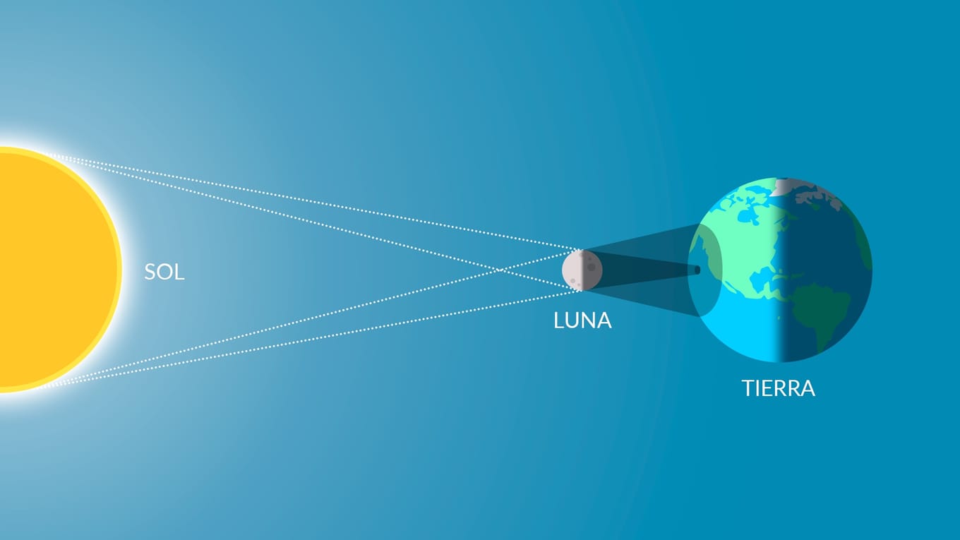 Un eclipse solar se produce cuando la Luna se alinea entre la Tierra y el Sol, proyectando una sombra sobre nuestro planeta. Se da la circunstancia de que la Luna es 400 veces más pequeña que el Sol pero está 400 veces más cerca de nosotros y esto da como resultado que en una pequeña franja de terreno nuestro satélite oculta totalmente el Sol, a esto lo denominamos eclipse solar total. Fuera de esa franja de terreno o franja de totalidad también se produce un eclipse pero en ese caso será parcial, que es menos impresionante.
