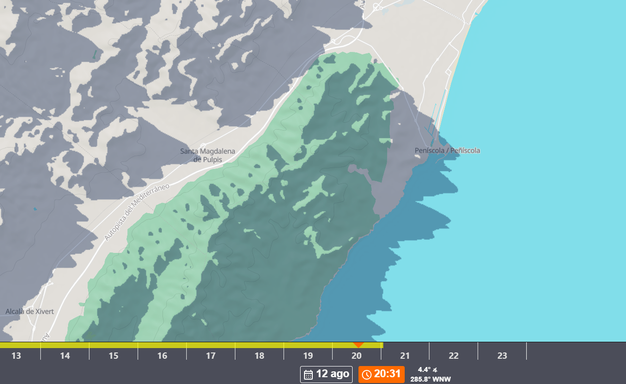 Pongamos por ejemplo la localidad Castellonense de Peñíscola que se encuentra dentro de la franja de totalidad, pero ¡Ops! Tiene unas montañas justo al noroeste que tapan la visión del eclipse, todo lo que aparezca en gris en este mapa son zonas donde el Sol está tapado por un accidente geográfico, lo que tendremos que hacer en estos casos es bordear esas montañas o bien desplazarnos a su cima si es posible.