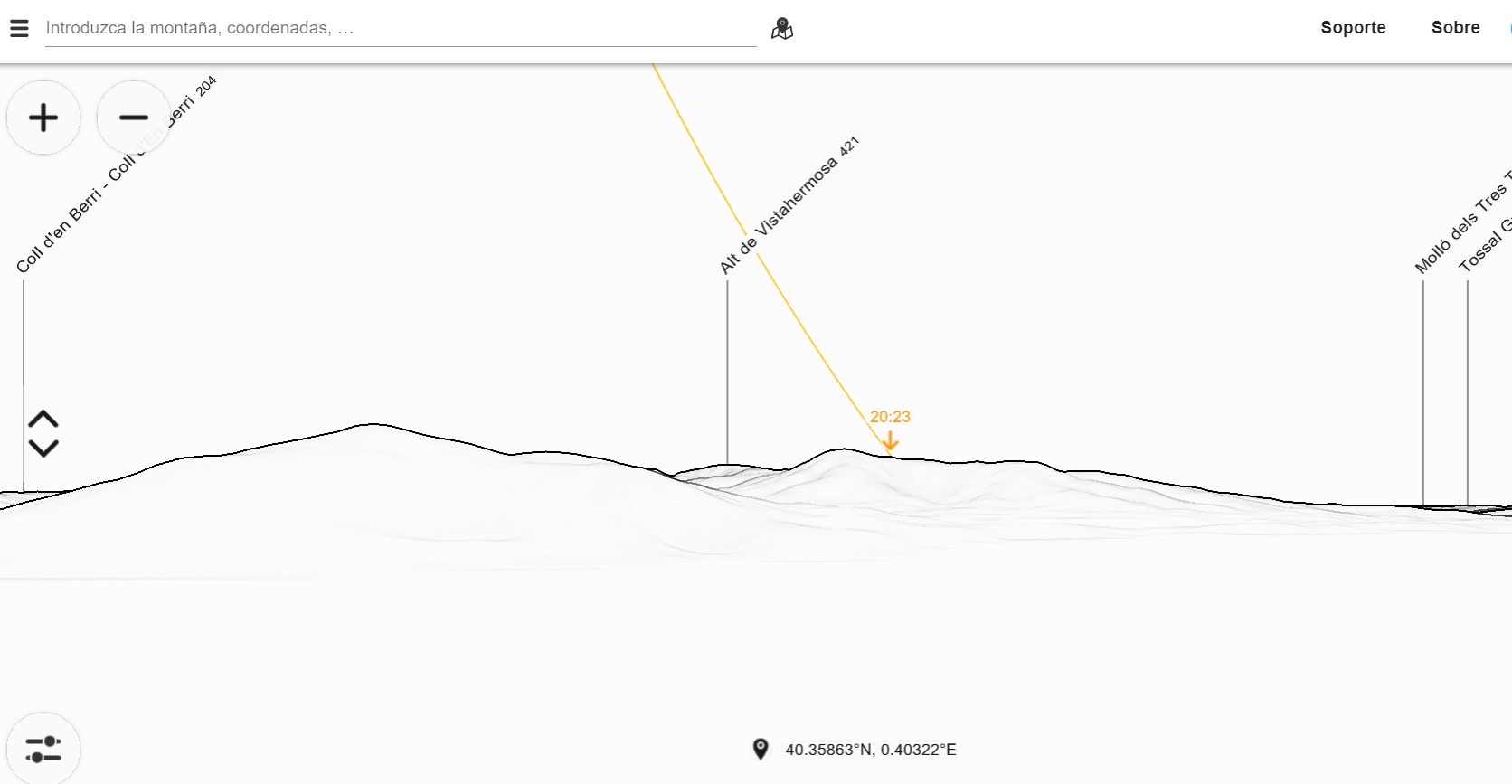 Otro recurso interesante es PeakFinder que simula el horizonte que vemos desde un punto en una fecha concreta y la ruta del Sol. En el caso de este lugar de Peñíscola que mencionábamos se trata del Alt de Vistahermosa, que nos tapa el Sol justo antes del inicio de la totalidad, imaginad el chasco si no lo tenemos en cuenta.