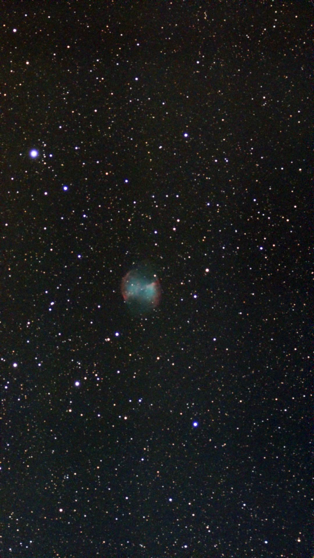 Los primeros días usé el telescopio desde casa, a través del balcón del salón. Como éste es alto tuve que utilizar un trípode fotográfico que tenía en casa. Después, abrí la ventana, me senté en el sofá y me puse a capturar imágenes de M27 cómodamente mientras veía una serie en Netflix. Gracias al filtro de banda estrecha incorporado (un filtro doble banda ([OIII] 30 nm/Halpha 20 nm)) que se activa automáticamente cuando encuadramos una nebulosa de emisión la astrofotografía desde ciudad es posible con este equipo.