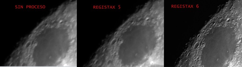 Recientemente el equipo de desarrollo de Registax, uno de los programas de tratamiento de imagen astronómica digital más utilizados, ha presentado la versión 6. Esta nueva versión ofrece importantes mejoras tanto en rendimiento (mayor rapidez en procesamiento), mayor facilidad de uso con un interface simplificado y lo más importante de todo: un uso mejorado de wavelets. Todo esto se traduce en imágenes más definidas y contrastadas, con resultados sorprendentes si lo comparamos incluso con la versión anterior. La siguiente imagen es un ejemplo de resultados obtenidos tomando un fotograma en bruto, procesando el video con Registax 5 y por último con Registax 6: